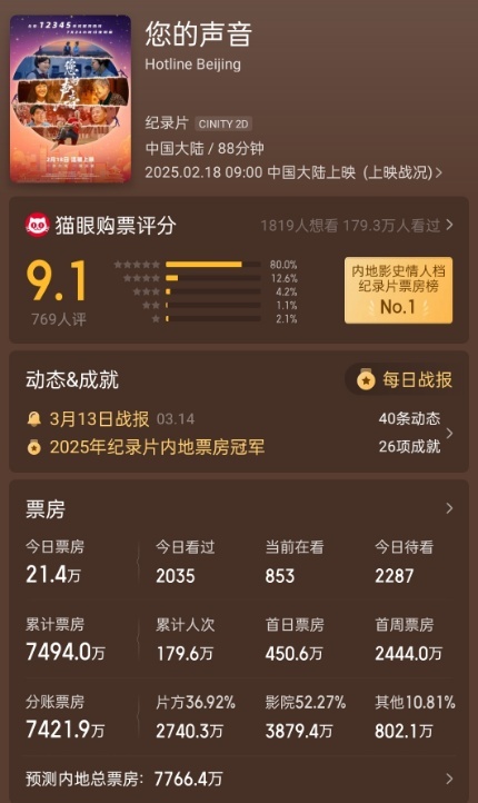 截至3月16日,影片累计票房已突破7000万元,荣登2025年纪录片内地票房冠军,并打破国产纪录片五年累计票房纪录。同时,影片主题曲《答案》短视频播放量超4000万次。